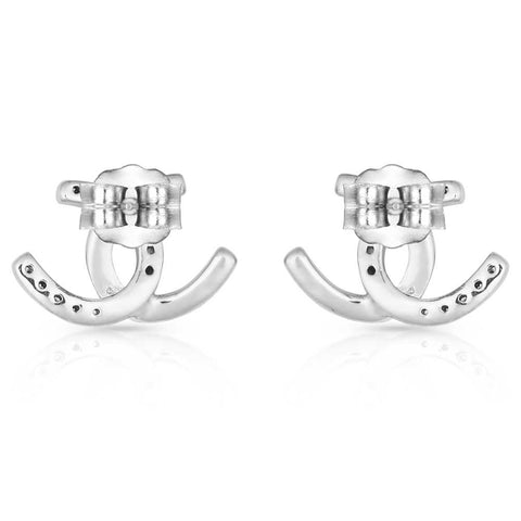 These stud earrings have a double horseshoe shape each tilted to the side. One horseshoe has a smooth bright silver tone that overlays the second clear stone encrusted horseshoe. Earrings have hypoallergenic stainless steel post backs.