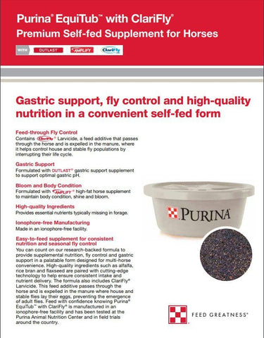 Feed with confidence knowing Purina® EquiTub™ with ClariFly® is manufactured in an ionophore-free facility and has been tested at the Purina Animal Nutrition Center and in field trials around the country.