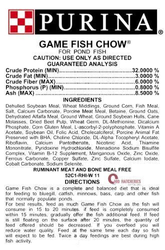 Complete and balanced 32%- protein, extruded, multi-particle size product designed to be fed to a wide variety of fish species and wide range of sizes of fish. Purina® Game Fish Chow® feed is rich in nutrients essential for optimal fish growth, reproduction and overall health. It works naturally with everyday food sources in your water to address poor nutrition, which is the most significant limiting factor in the size and health of forage fish.