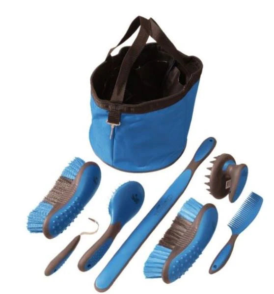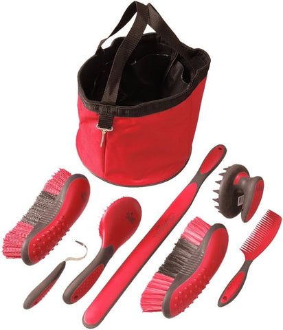 Everything you need to get your groom on! This set includes seven ergonomically designed grooming tools and a handy nylon tote with clip. Tools included: Stiff brush, soft brush, hoof pick, cone tooth curry, comb, mane and tail brush, and a sweat scraper