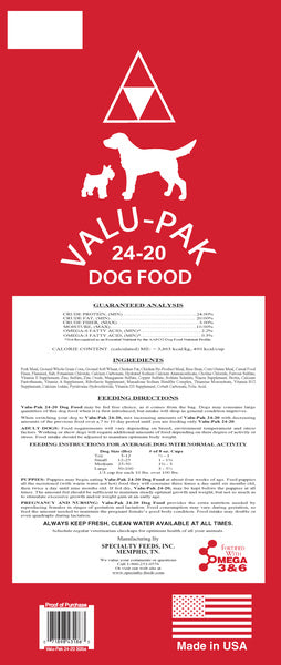 Valu-Pak 24-20 Dog Food is Formulated To Meet The Nutritional Levels Established by The AAFCO Dog Food Nutrient Profiles For All Life Stages.