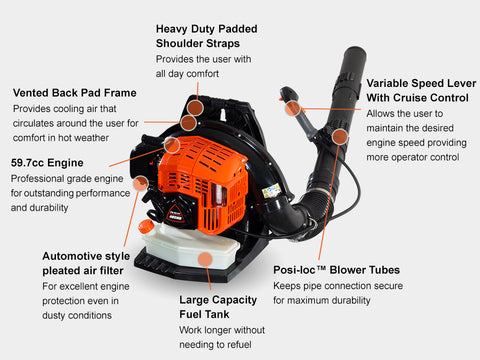 MSRP | $499.99The PB-5810T backpack blower is equipped with a tube-mounted throttle and utilizes the next generation of engine technology. It's designed for a homeowner's light mowing cleanups as well as for wet, heavy leaves encountered by professional landscapers.