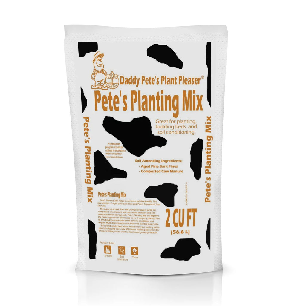 Daddy Pete’s Planting Mix helps to enhance soils back to life. This mix consists of Daddy Pete’s Composted Cow Manure and aged pine bark fines.