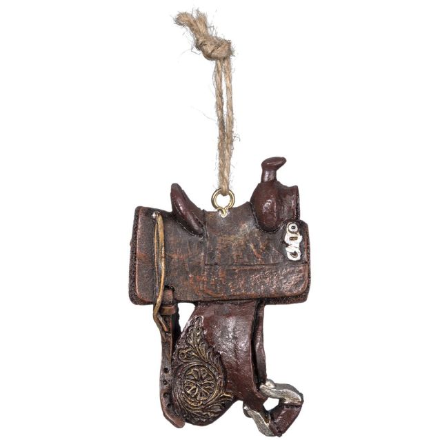 Can't have a western tree without a saddle! Roper style saddle with stirrups and rear cinch. Twine hanger. Resin.