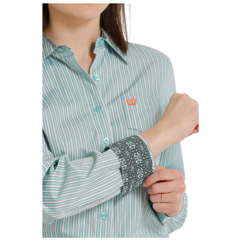 This bold, solid Blue Pinstripe women's button-down western shirt is both performance-ready and eye-catching.