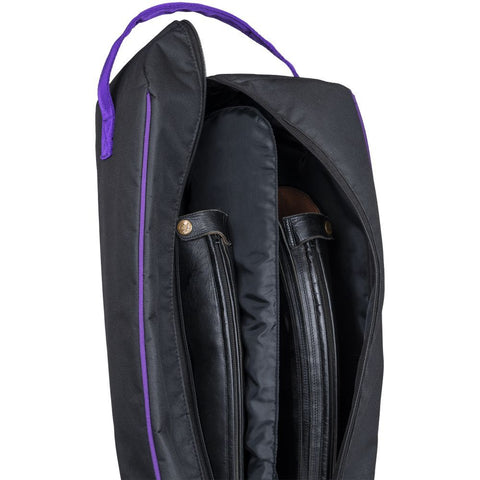 This stylish English boot bag features padded sides and an inner divider for keeping your boots protected and clean! It comes with a convenient webbed carrying handle as well as a removable, adjustable shoulder strap. The zipper closure opens completely, making it easy to load and remove each boot. This is a great option for awards with space for embroidery and screen-printing.