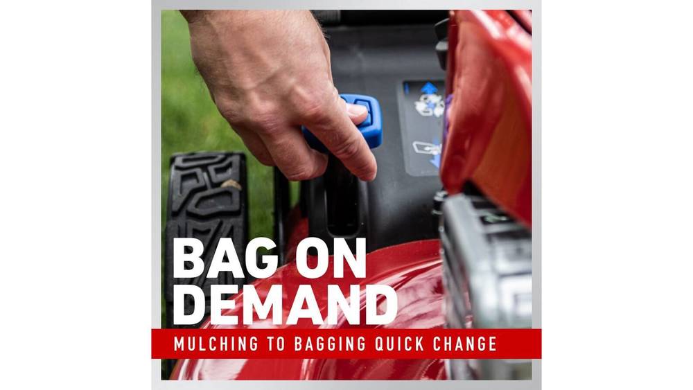- Bag On Demand: Switch from mulching to bagging in seconds while leaving the bag on the mower.