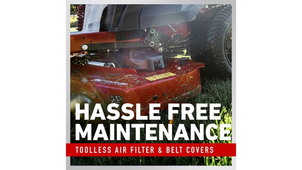 - Toolless Belt Cover: Simply unlatch the belt cover and easily sweep away debris to prevent deck corrosion and belt wear.
